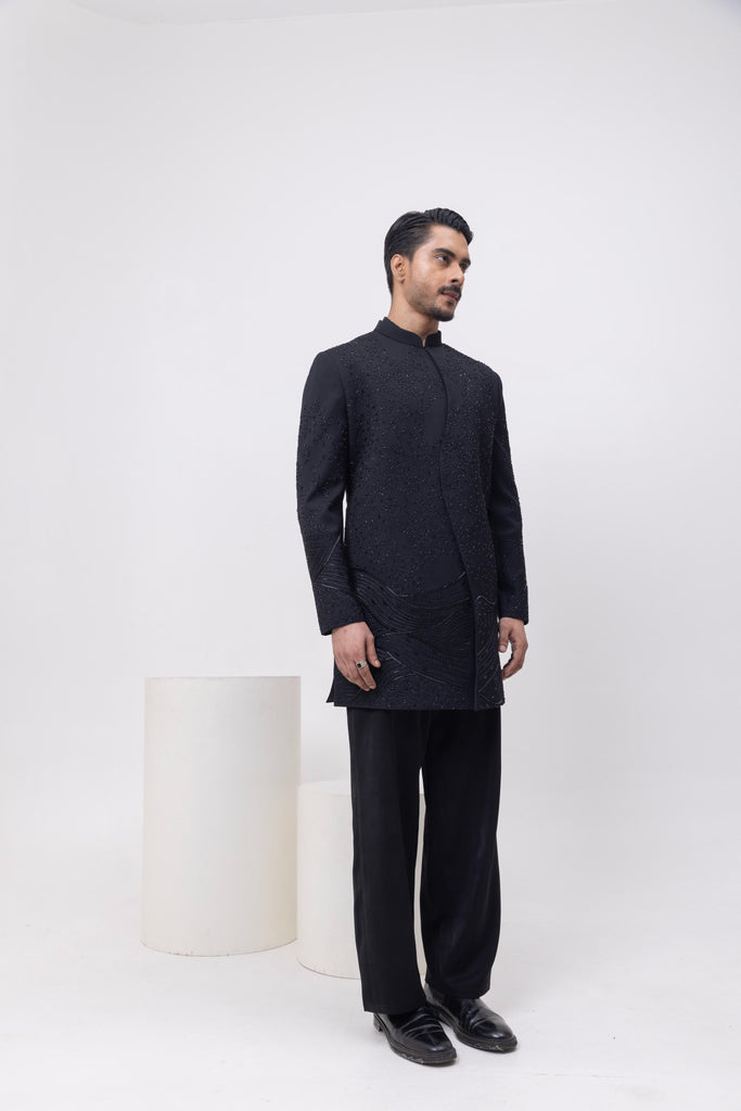 A twilight canvas scattered with beads like constellations, this black bandhgala set with trousers is where sharp tailoring meets cosmic romance. Perfect for grooms or groomsmen seeking quiet drama, this piece commands the room without raising its voice.