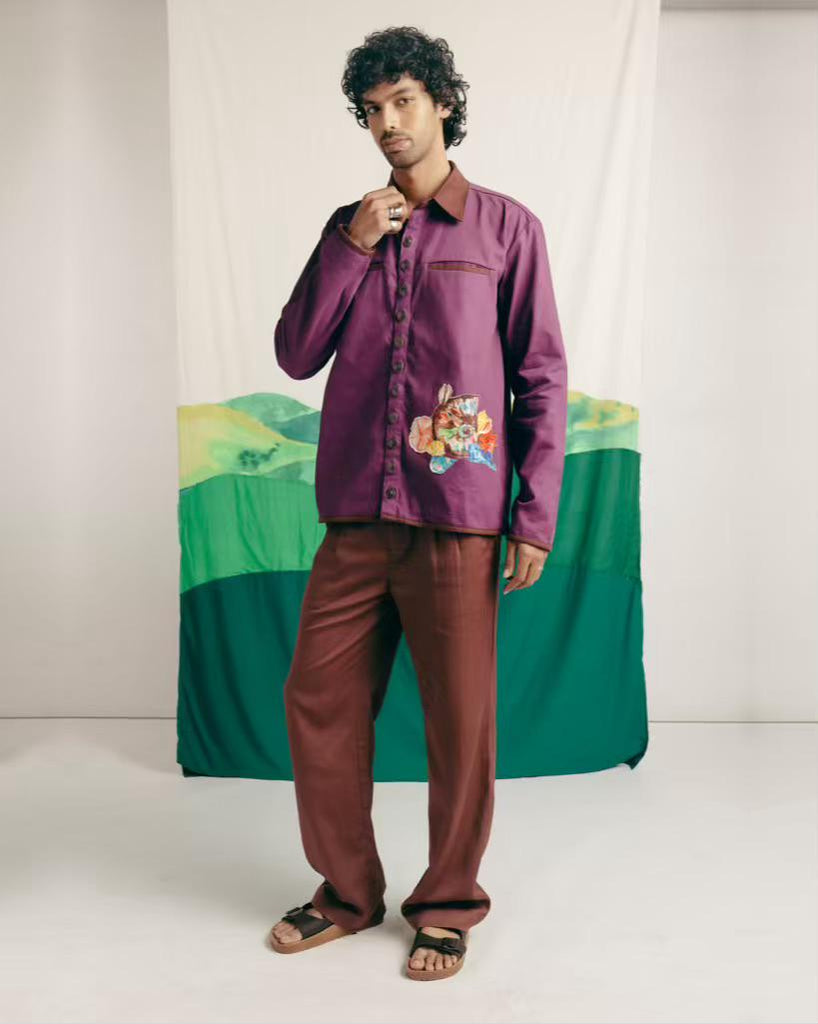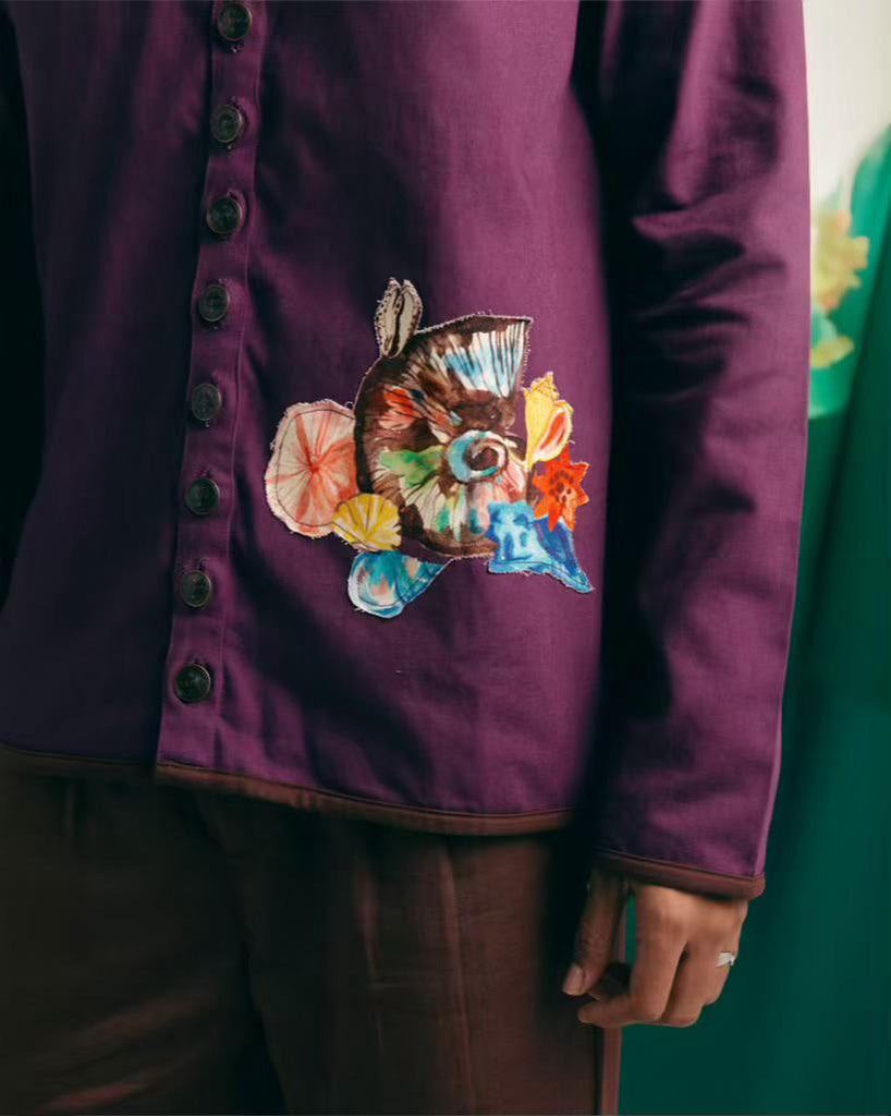 | Rooted in the mythology of Samudra Manthan, this jacket reimagines the ratnas as hand-appliquéd shell motifs—each one a modern interpretation of those legendary treasures. Set against a rich plum base, the silhouette is clean and structured, highlighted by a distinctive placket with closely placed statement buttons. Subtle contrast trims define the collar and seams, while the back stays minimal with a single vertical detail. Crafted in a smooth, organic cotton fabric, it’s a piece that balances narrative, craft, and wearability. |