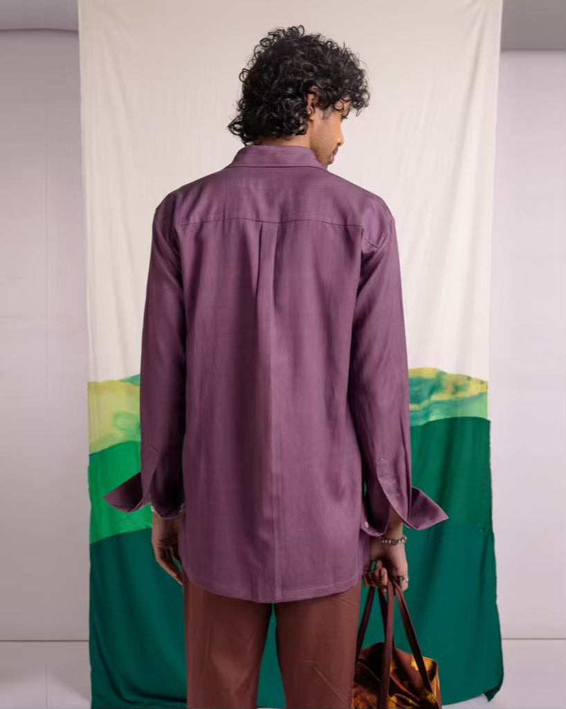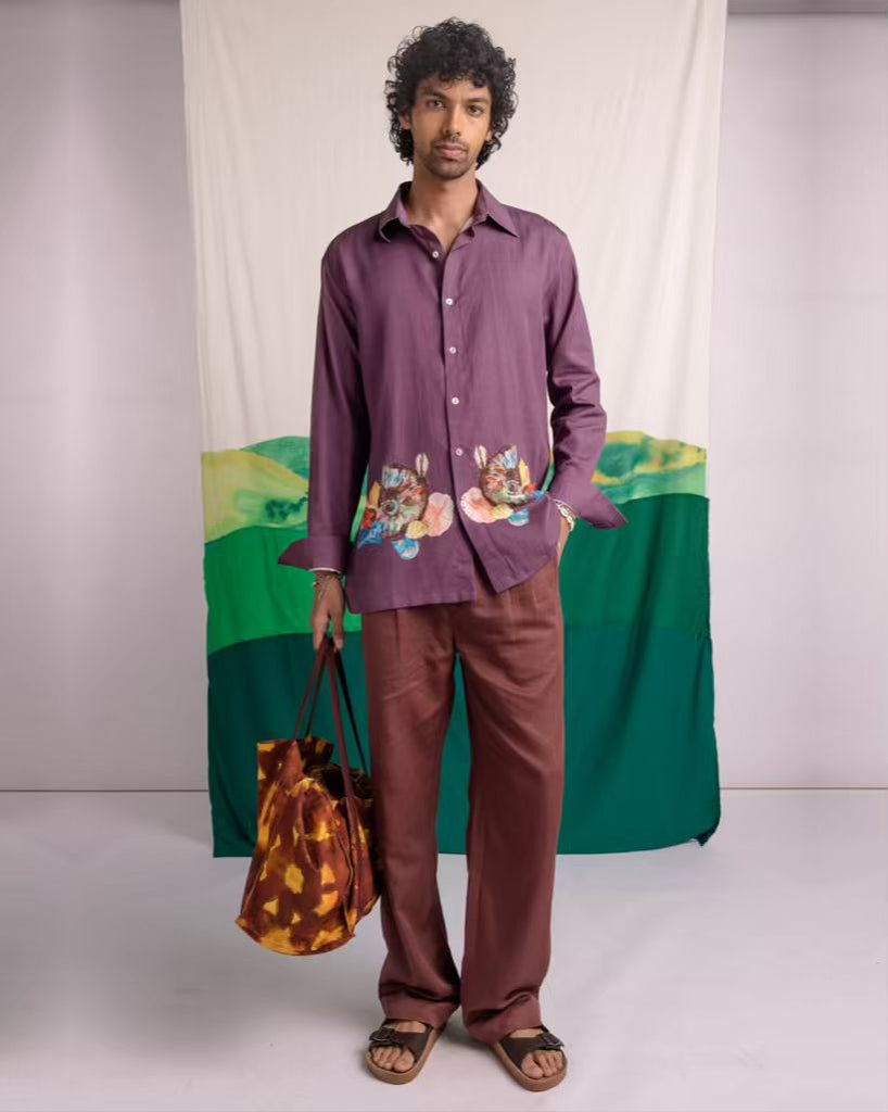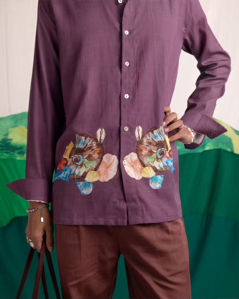 | A quiet nod to the treasures of Samudra Manthan, this shirt features a printed shell motif along the hem—reimagining the mythical ratnas through soft, painterly detail. Set on a rich plum base, the silhouette is clean and easy, with a classic collar and a smooth, breathable finish. The cuffs are designed for versatility, styled rolled up for a relaxed feel. Subtle yet story-driven, it’s a piece that is easy to wear & brings together mythology and modern ease. |