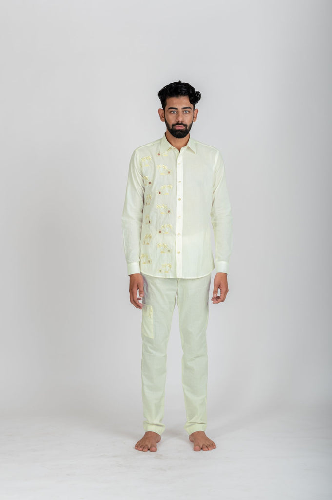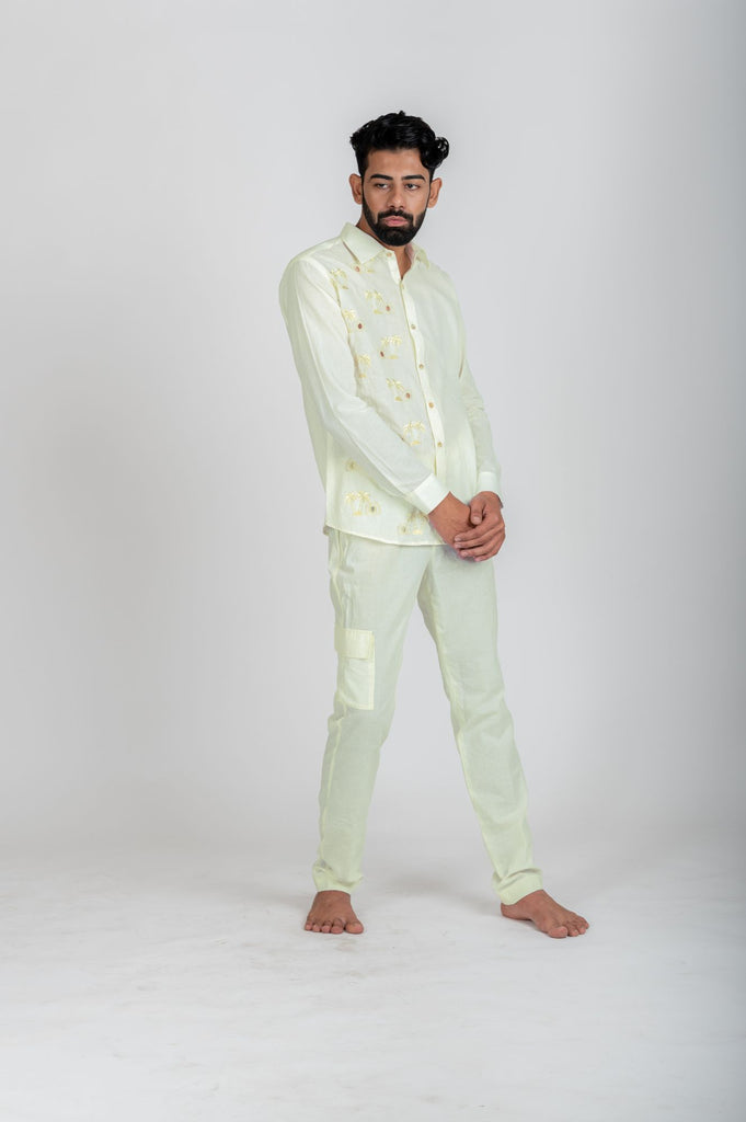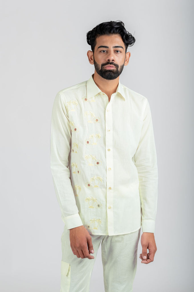 Capture your memories of vacay wearing this embroidered ivory tone on tone and hand cut designs of palm tree and camera on one panel of shirt. A perfect spring-summer vacation mood lifter and easy-light weighted to carry.
