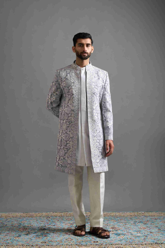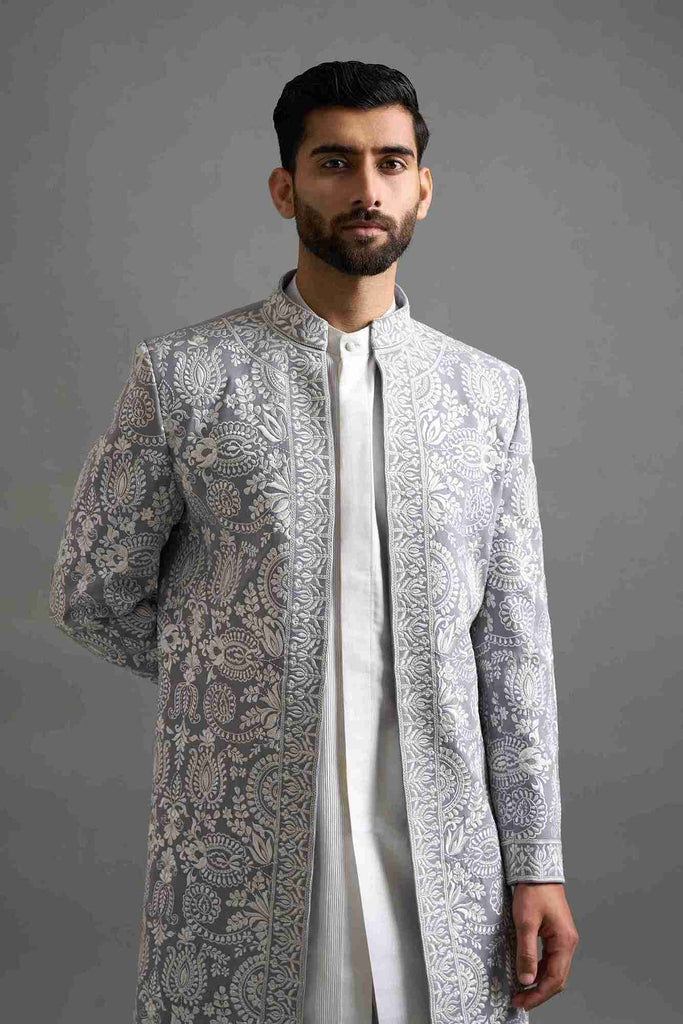 A regal silver-grey Indo-Western with intricate resham embroidery. Perfect for grooms and festive occasions, it blends Indian heritage with modern finesse for an effortlessly royal look.