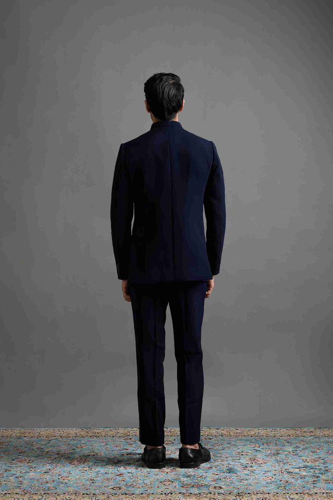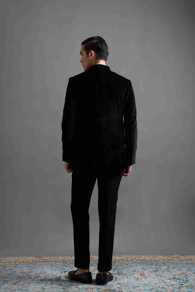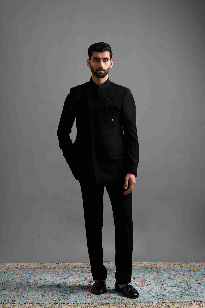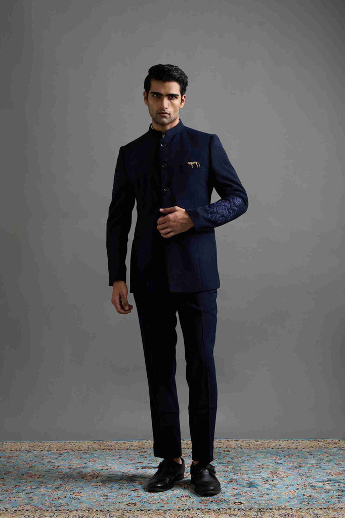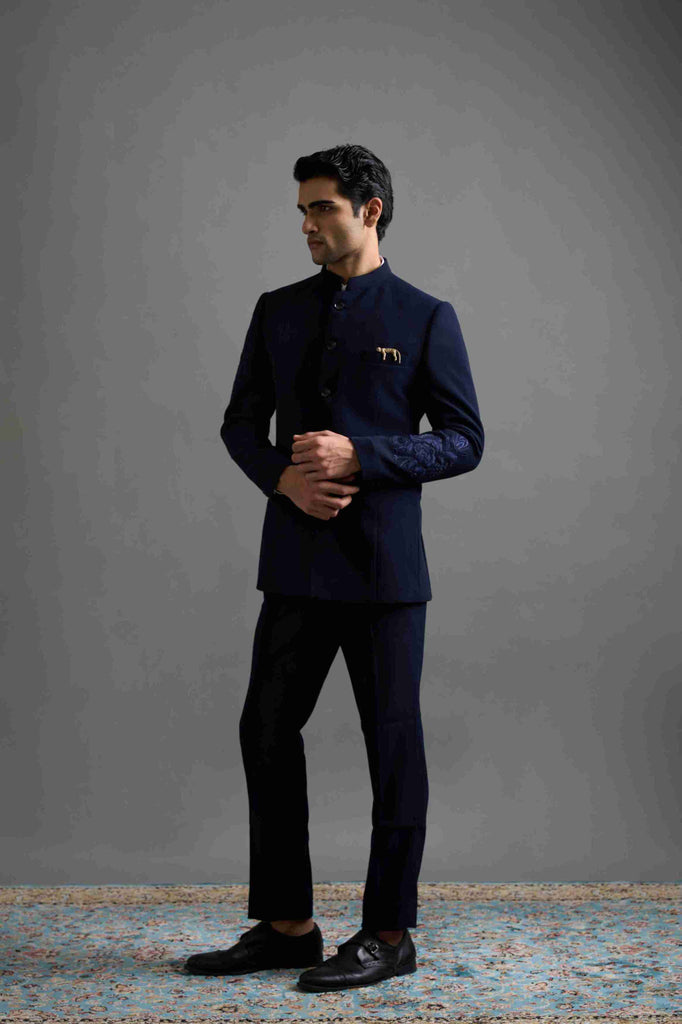 A midnight-hued Jodhpuri with understated sleeve embroidery and an elegant brooch. Designed with tonal trousers and ban collar shirt for a contemporary yet traditional statement.