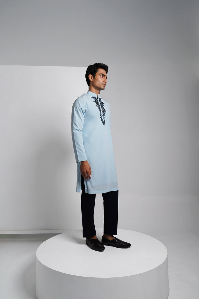 - Soft sky blue kurta in 100% Silk - Intricate thread and sequin hand embroidery- Mandarin collar with classic placket finish.- Paired with Navy Blue straight trousers.- Perfect blend of subtle charm and festive detailing.