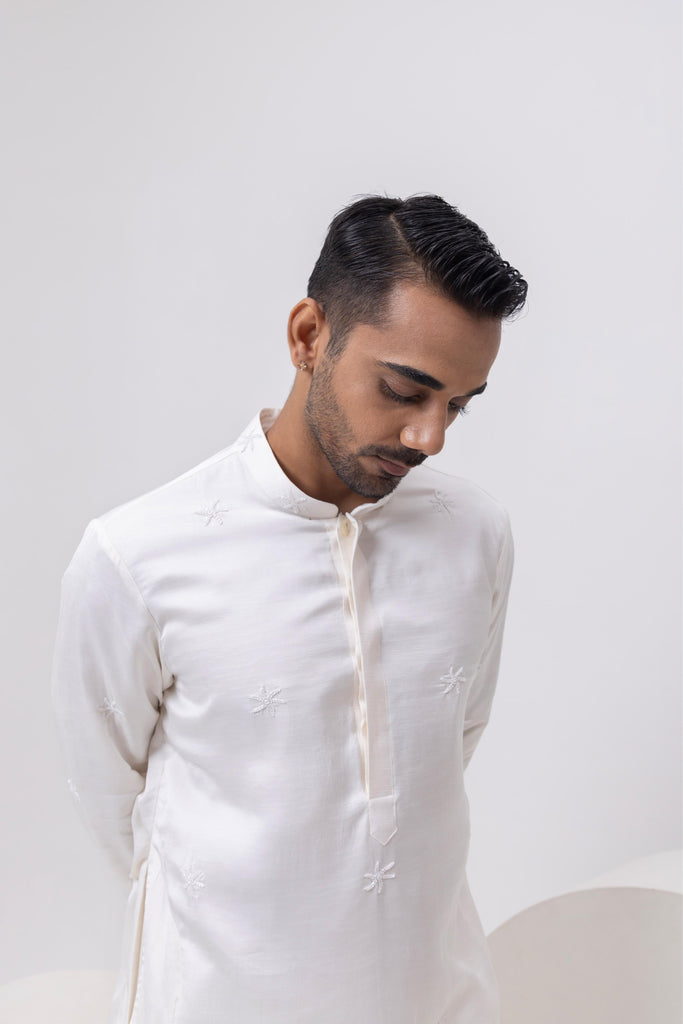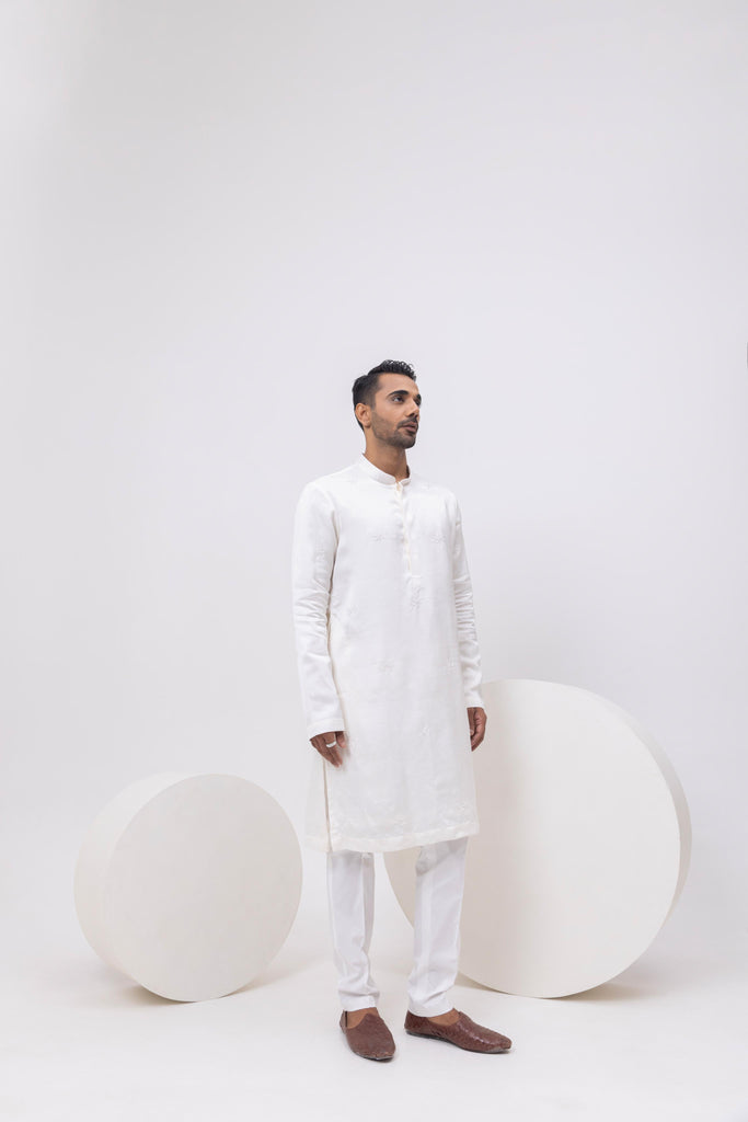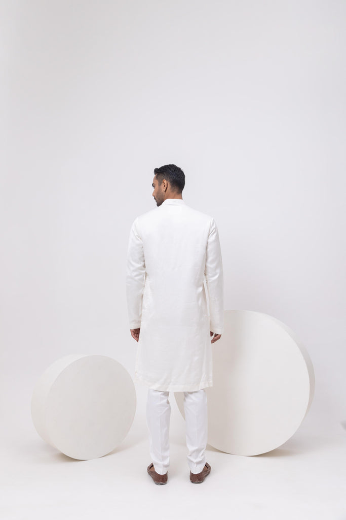 Crafted in luxurious silk, this ivory designer kurta pants for men exudes understated elegance. Adding style with pintucks and structure, it brings together minimal design, making it a timeless piece for any refined celebration.