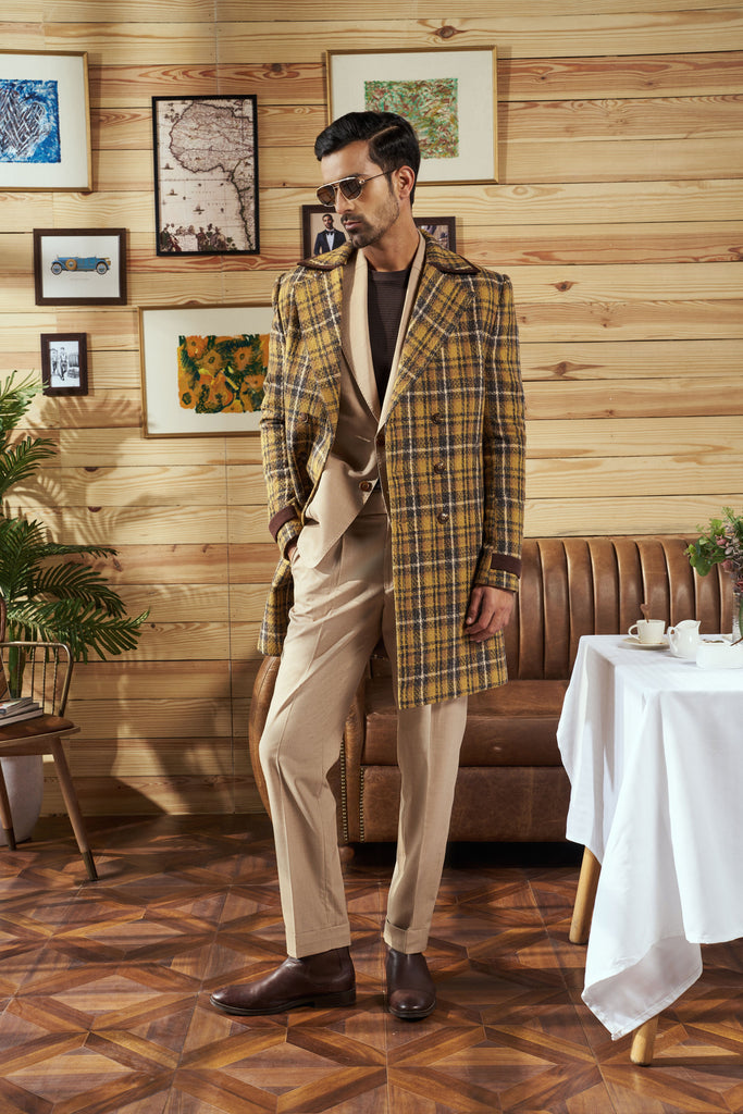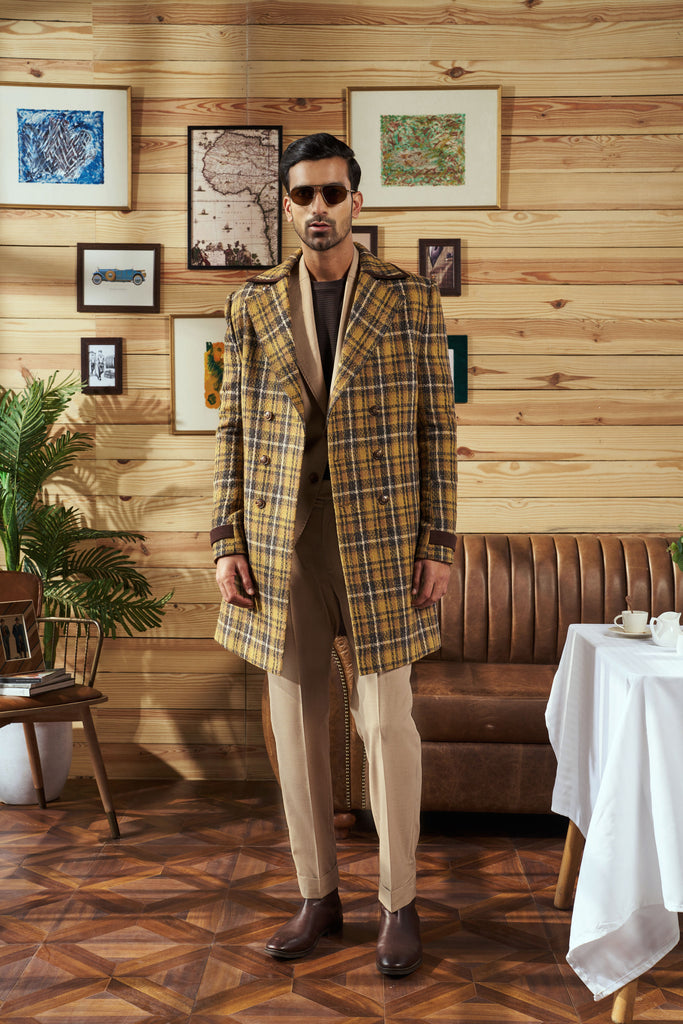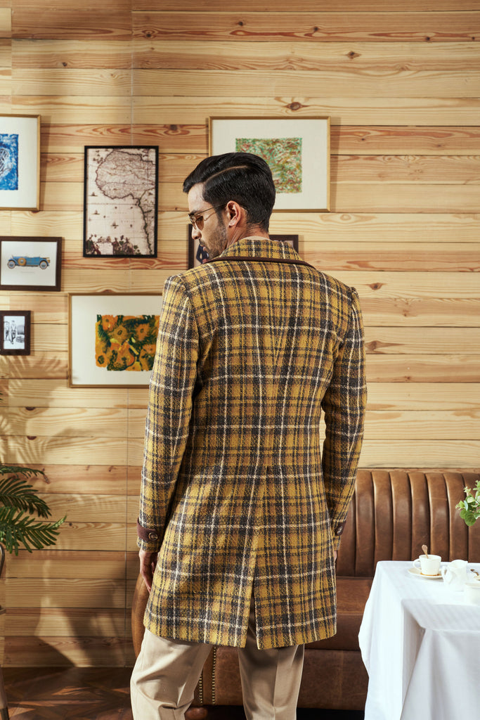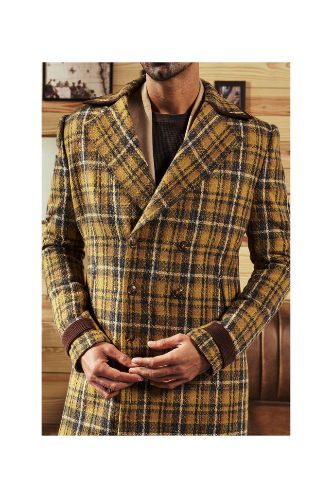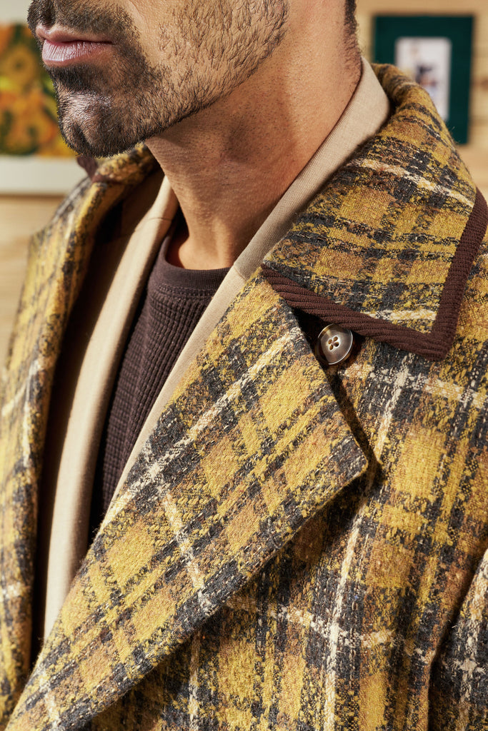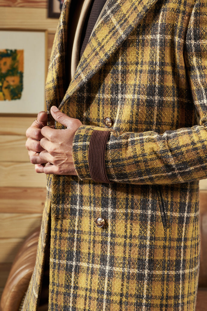 This yellow checked overcoat is like sunshine in a jacket. Made from flannel wool, it’s warm and cozy, with just the right amount of boldness to make you stand out in any crowd. The corduroy detailing on the lapel and cuffs adds a stylish twist that elevates the whole look....