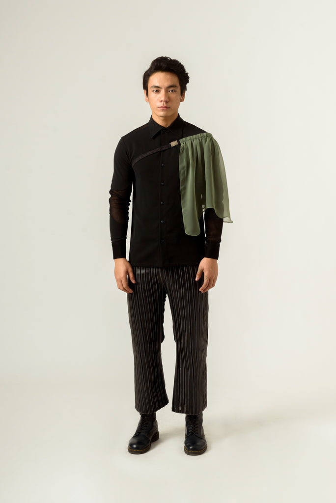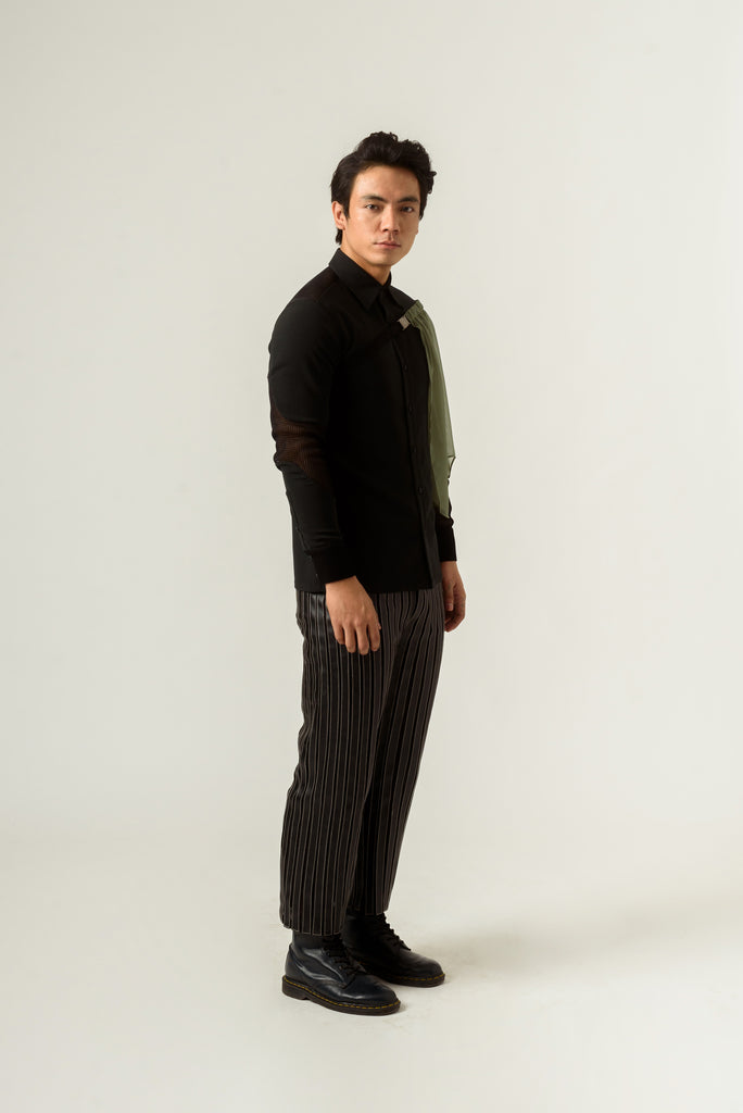 This royal look can make anyone feel special. The spectacular artwork of stripes elongated the legs. Love stripes then this trousers is a must have. Created with the PU leather patchwork on georgette, this style is one of a kind. Lined with textured crepe, it features a front button opening.
