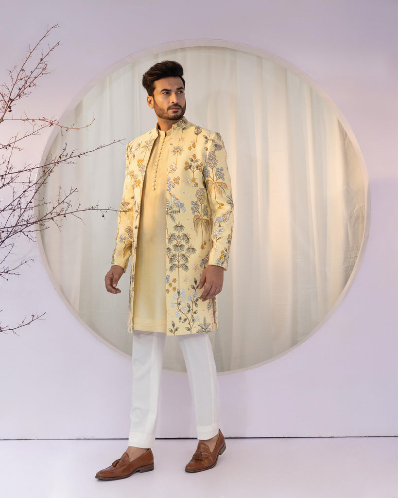 Featuring a floral printed lime front opening jacket and kurta, paired with slim fit pant pyjama.