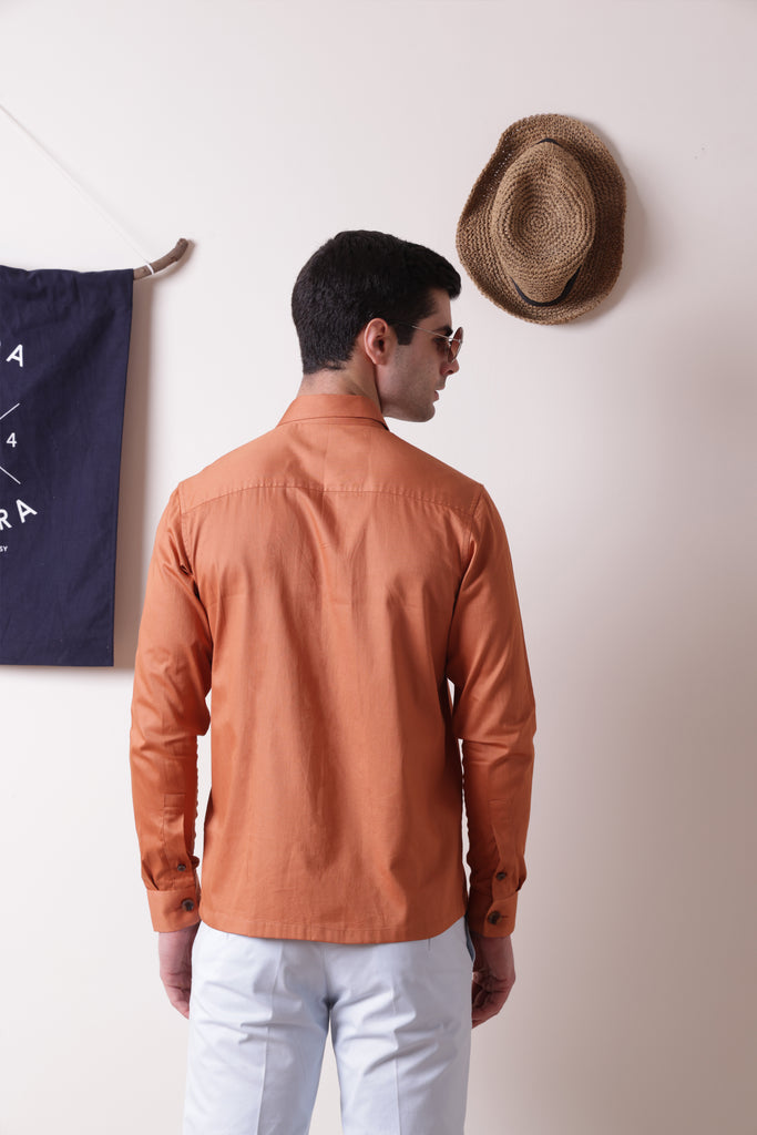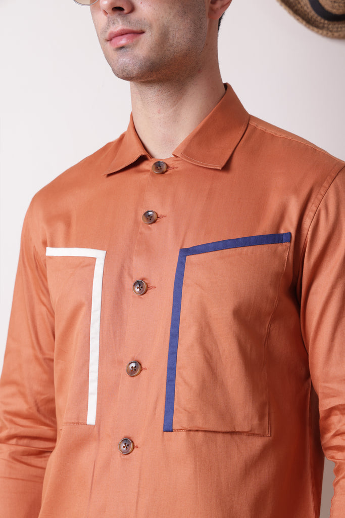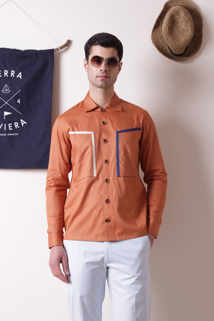 A carrot shacket collar shirt, a versatile blend of shirt and jacket design, featuring statement pockets and contrasting piping details for added flair. Crafted from high-quality cotton, this garment offers both comfort and durability, making it a staple for summer weather. The bold hue adds vibrancy to your wardrobe, while the shacket collar adds a modern twist. Pair it with jeans or chinos for a casual look, or layer it over a T-shirt for added warmth on cooler days. Elevate your casual wear with this eye-catching shirt-jacket hybrid, designed for the modern man who values both style and functionality.
