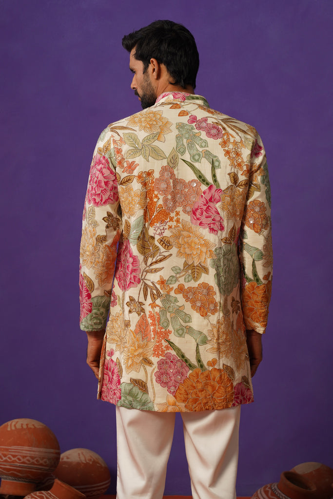 Crafted in luxurious pure silk, this short kurta is a vibrant expression of elegance and youthful charm. The surface features a rich floral print in lively hues, beautifully enhanced with fine embroidery outlining that adds depth and texture to the design. The smooth silk base lends a natural sheen and refined finish, elevating its overall appeal. With its fresh, young and vibrant aesthetic, this piece stands out effortlessly. Paired with classic bottoms, the silhouette remains clean and contemporary, perfect for any occasion where style meets energy and sophistication.