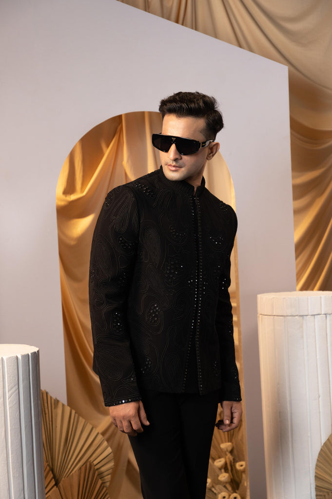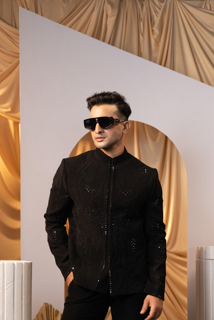 Featuring a black mirror embellished jacket paired with matching trousers.