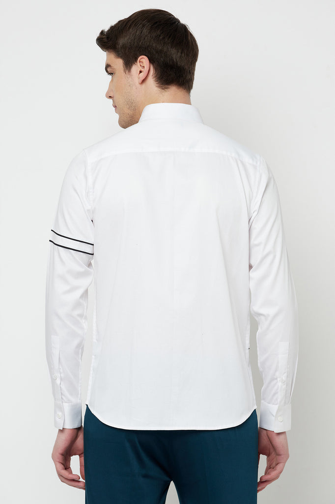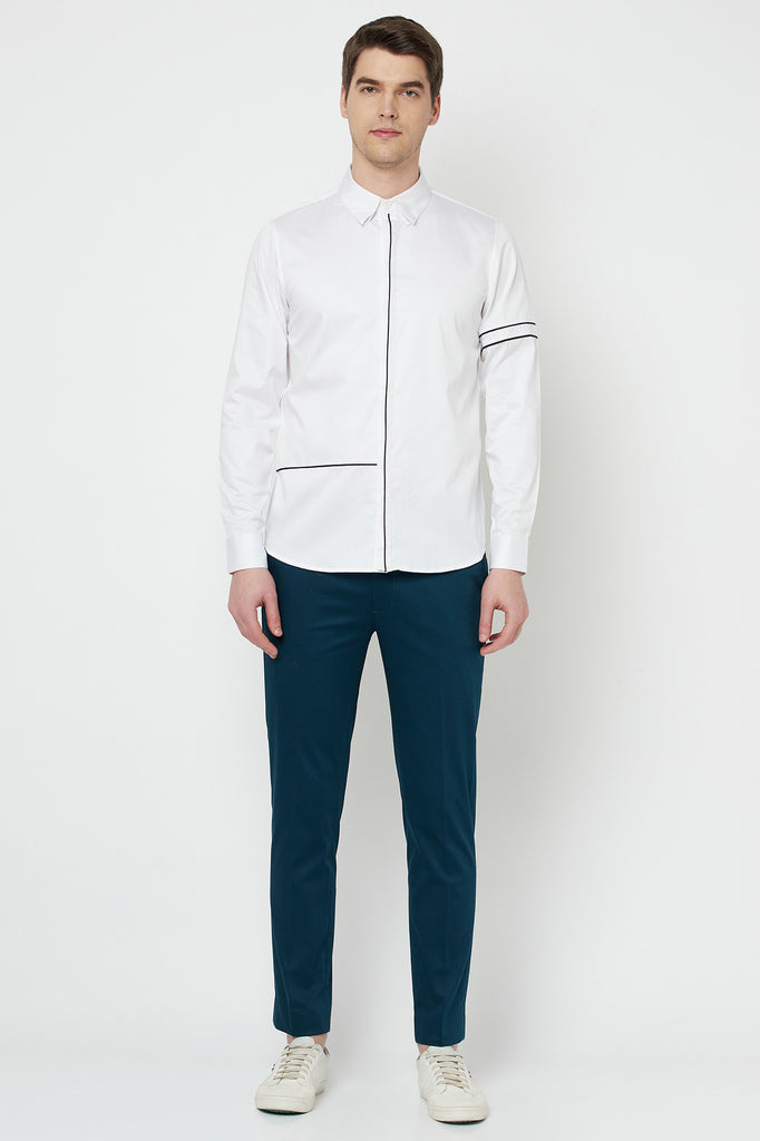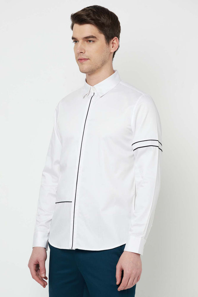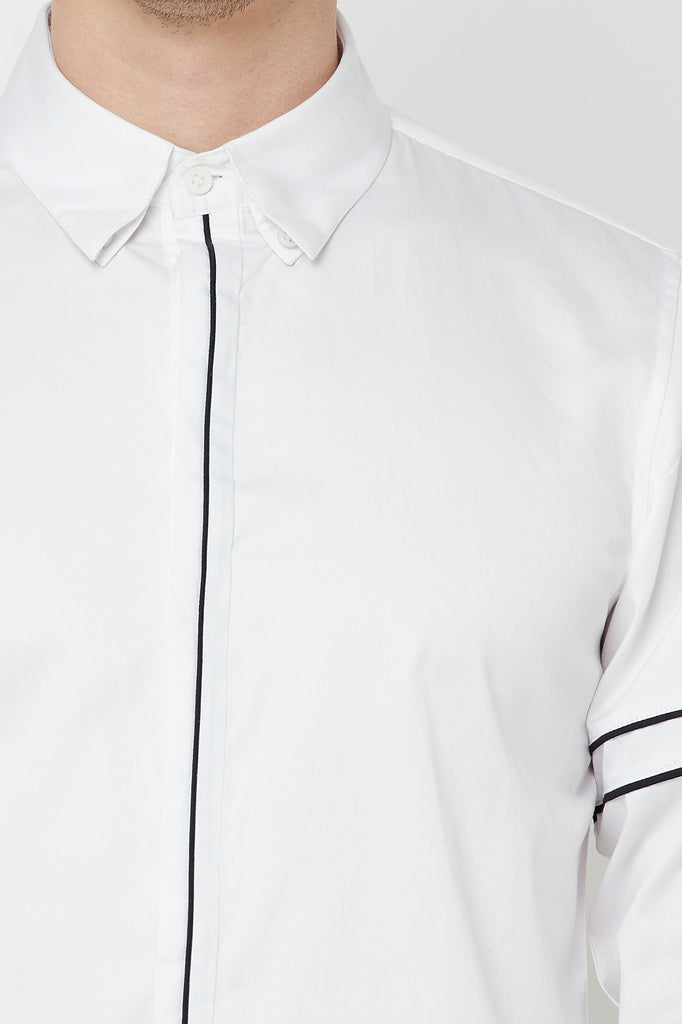 White full sleeve shirt with black piping detail all the way across in sleeve, placket and front panel. This style is so distinctive and sophisticated due to its crisp design.