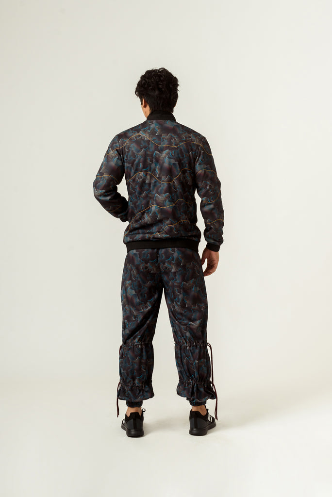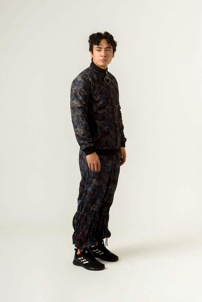 With double knit rib collar, cuff and hem this upper layer of clothing is quite a piece. Style this with a matching print trouser to make a monochromatic look. Crafted in poly lycra, this agitation printed jacket features genuine leather front zip loop tassel. It is quilted with cotton padding...