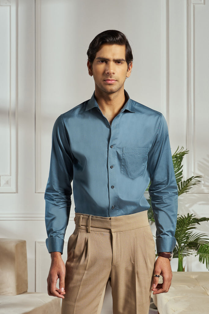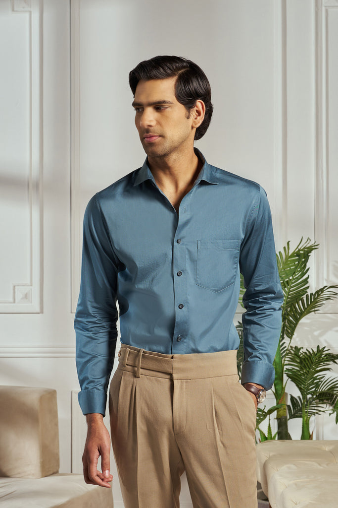 The Vesper shirt in rich teal blue is the epitome of cocktail sophistication. Designed with a sharp silhouette, it features elegant turn-up cuffs that add a touch of refinement to its modern appeal. Perfect for evening soirées and semi-formal gatherings, the Vesper shirt embodies effortless charm and versatile style, making it the ideal choice for making a lasting impression.
