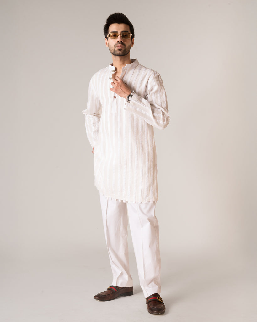 This kurta features white fabric strips stitched precisely on a cotton linen base. It’s simple, sleek, and a little extra where it counts. Perfect for weddings, brunches, or whenever you want to outshine the crowd without trying too hard.Comes with White trousers made in cotton satin fabric, featuring side pockets...