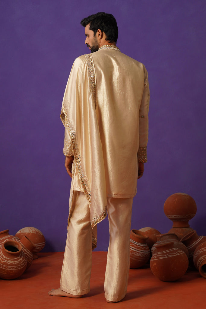 This ensemble is a bold statement in festive luxury defined by its rich beige hue and intricate craftsmanship. The kurta features dense geometric embroidery concentrated along the front panel creating a striking focal point with a textured opulent finish. Complemented by a matching dupatta detailed with ornate borders it enhances the regal character of the look. The band collar and structured silhouette add a sense of authority making it a perfect choice for grand occasions where tradition meets elevated contemporary style.