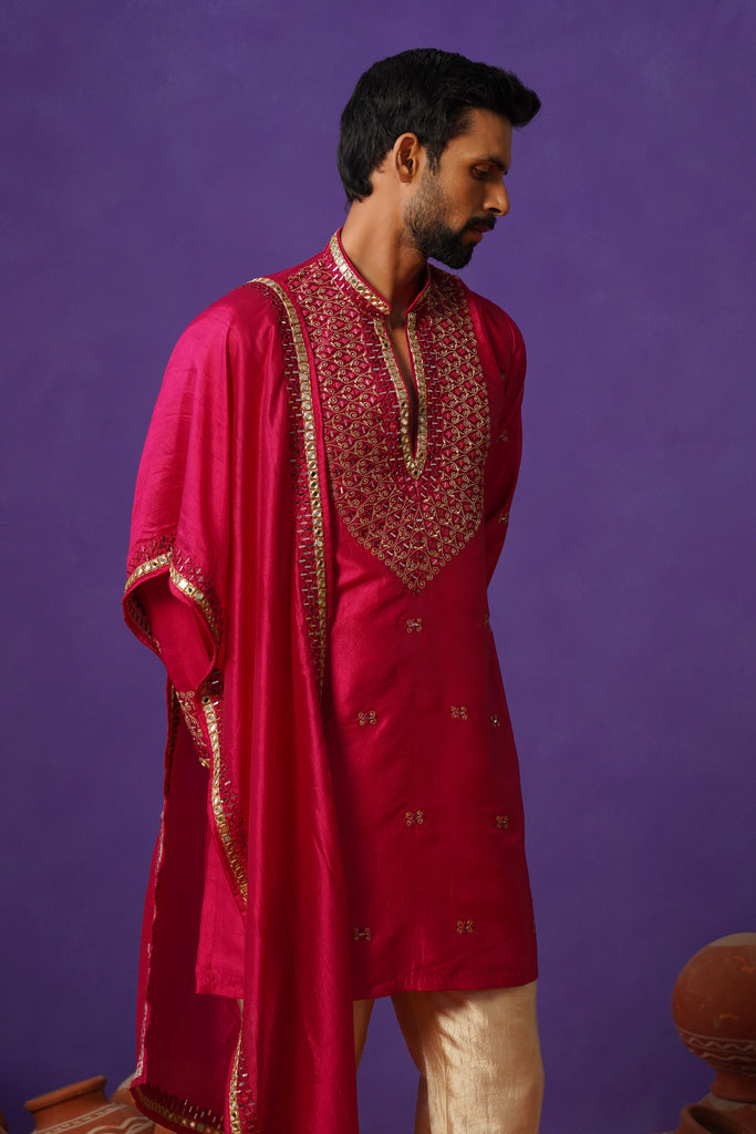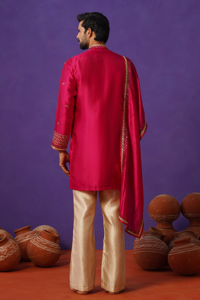 This ensemble is a bold statement in festive luxury defined by its rich magenta hue and intricate craftsmanship. The kurta features dense geometric embroidery concentrated along the front panel creating a striking focal point with a textured opulent finish. Complemented by a matching dupatta detailed with ornate borders it enhances the regal character of the look. The band collar and structured silhouette add a sense of authority making it a perfect choice for grand occasions where tradition meets elevated contemporary style.